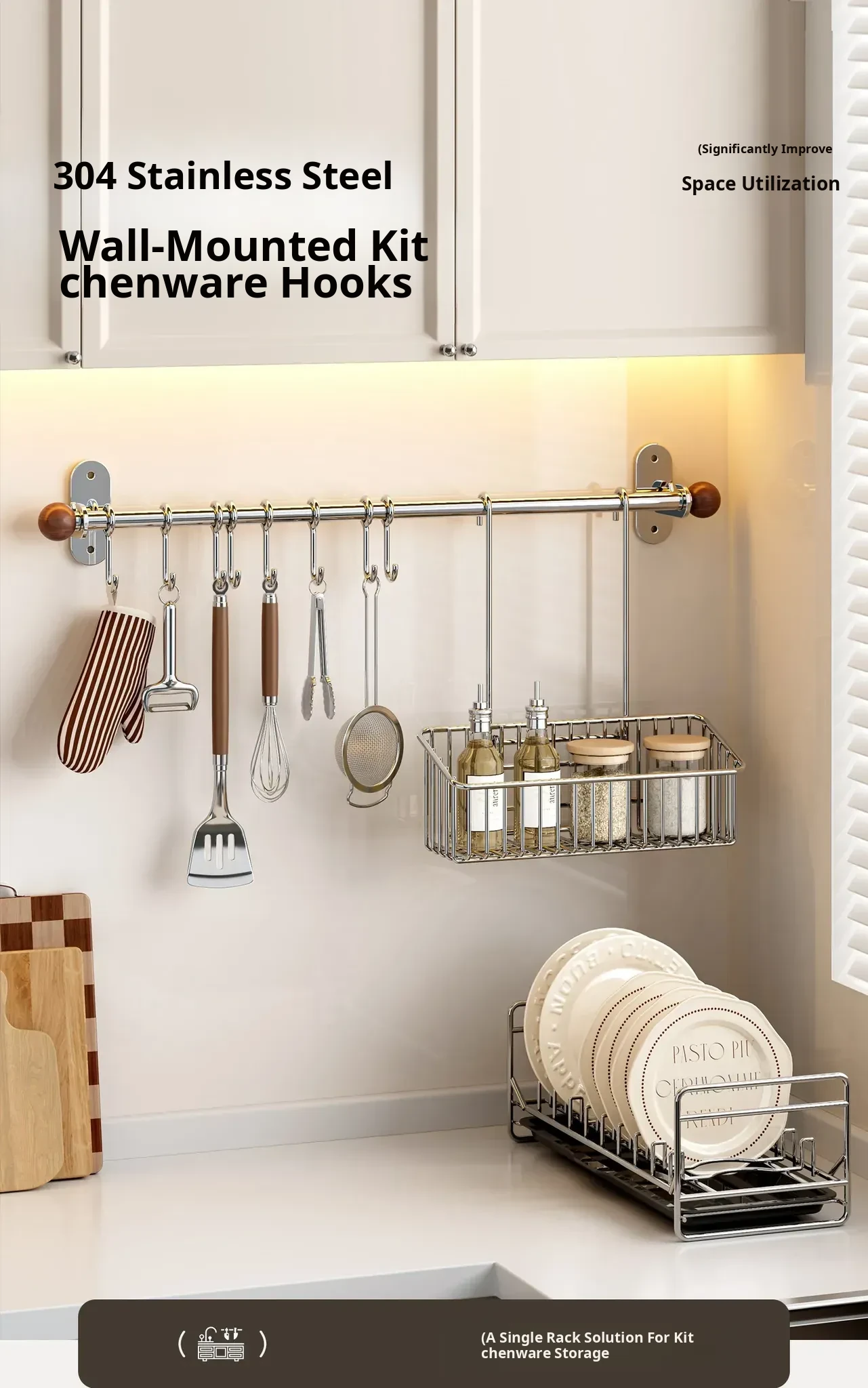 304 Stainless Steel Kitchen Wall Hooks - No Drill Hanging Storage Rack for Utensils, Spatulas, Chopsticks, Spoons, and Knives - Space-Saving Organizer for a Clutter-Free Kitchen