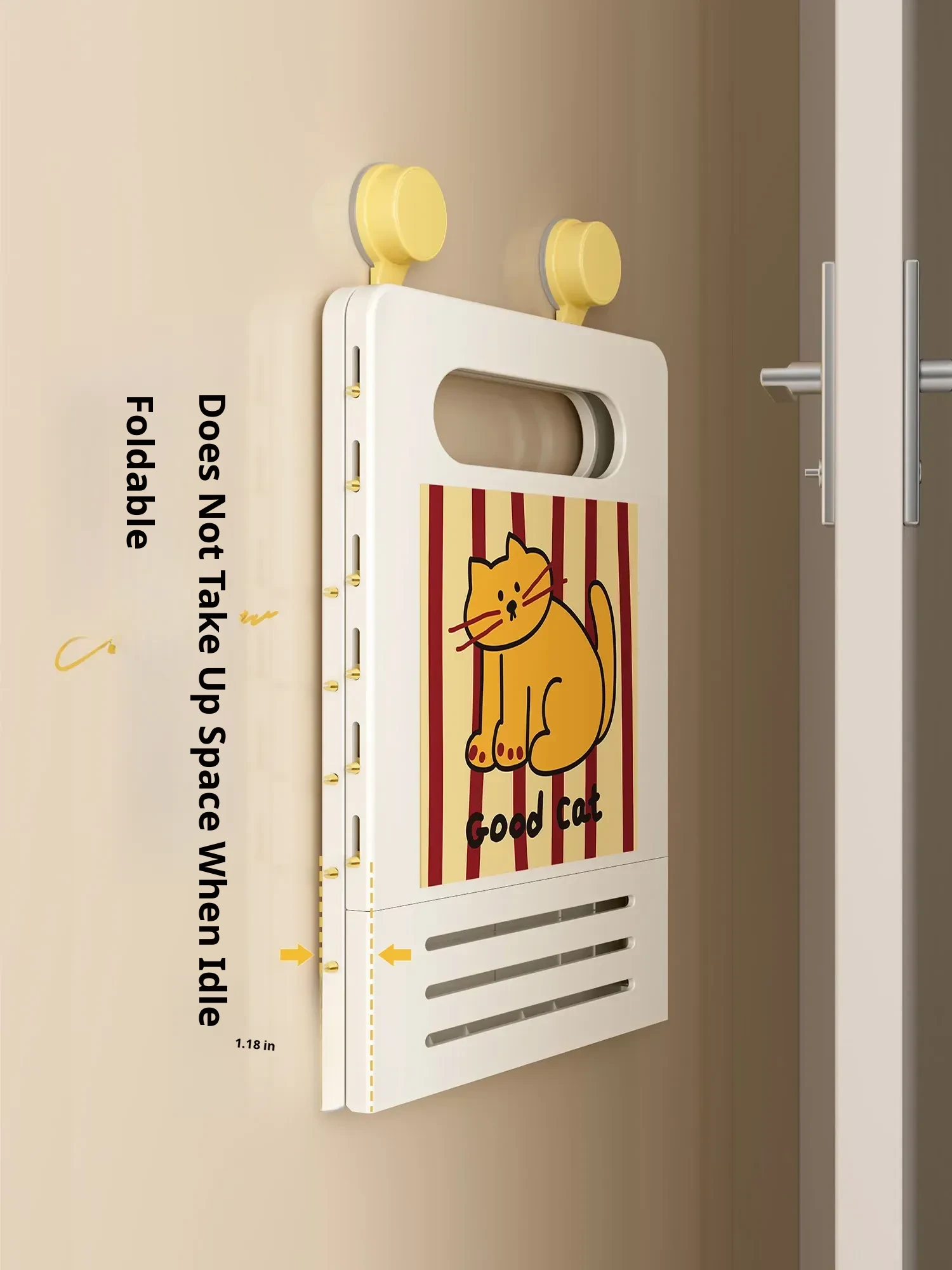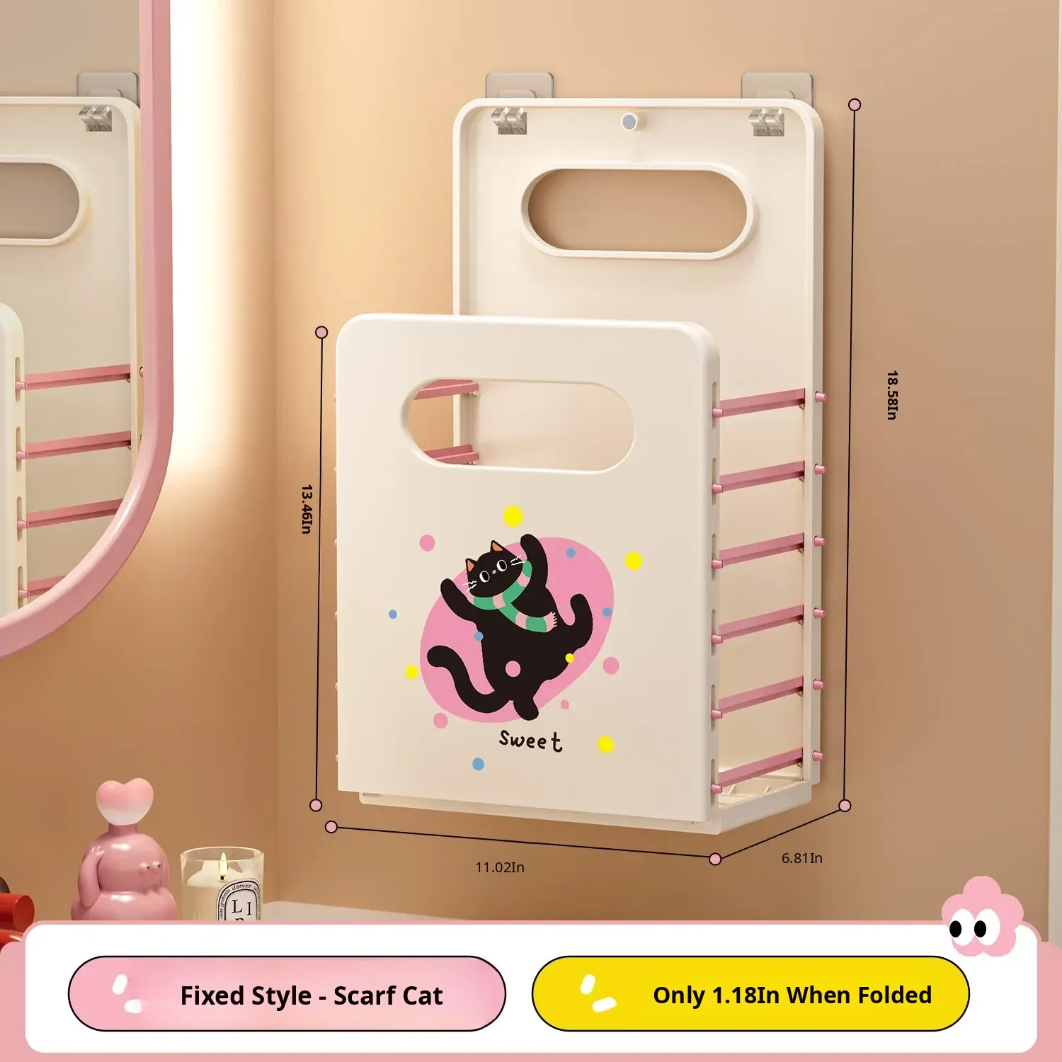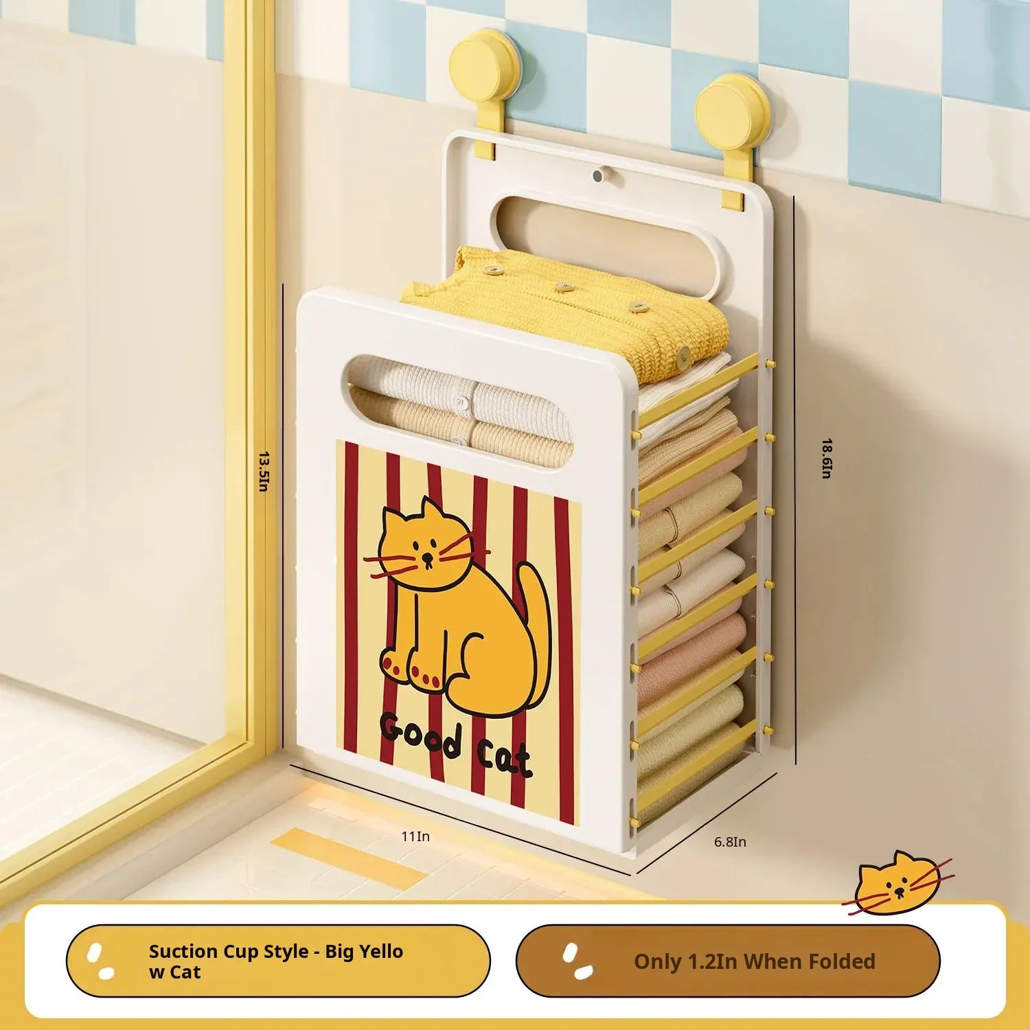 Cartoon Cat Wall-Mounted Foldable Laundry Basket - Large Capacity Storage Bin with Suction Cups, No Drilling Required for Bathroom Use