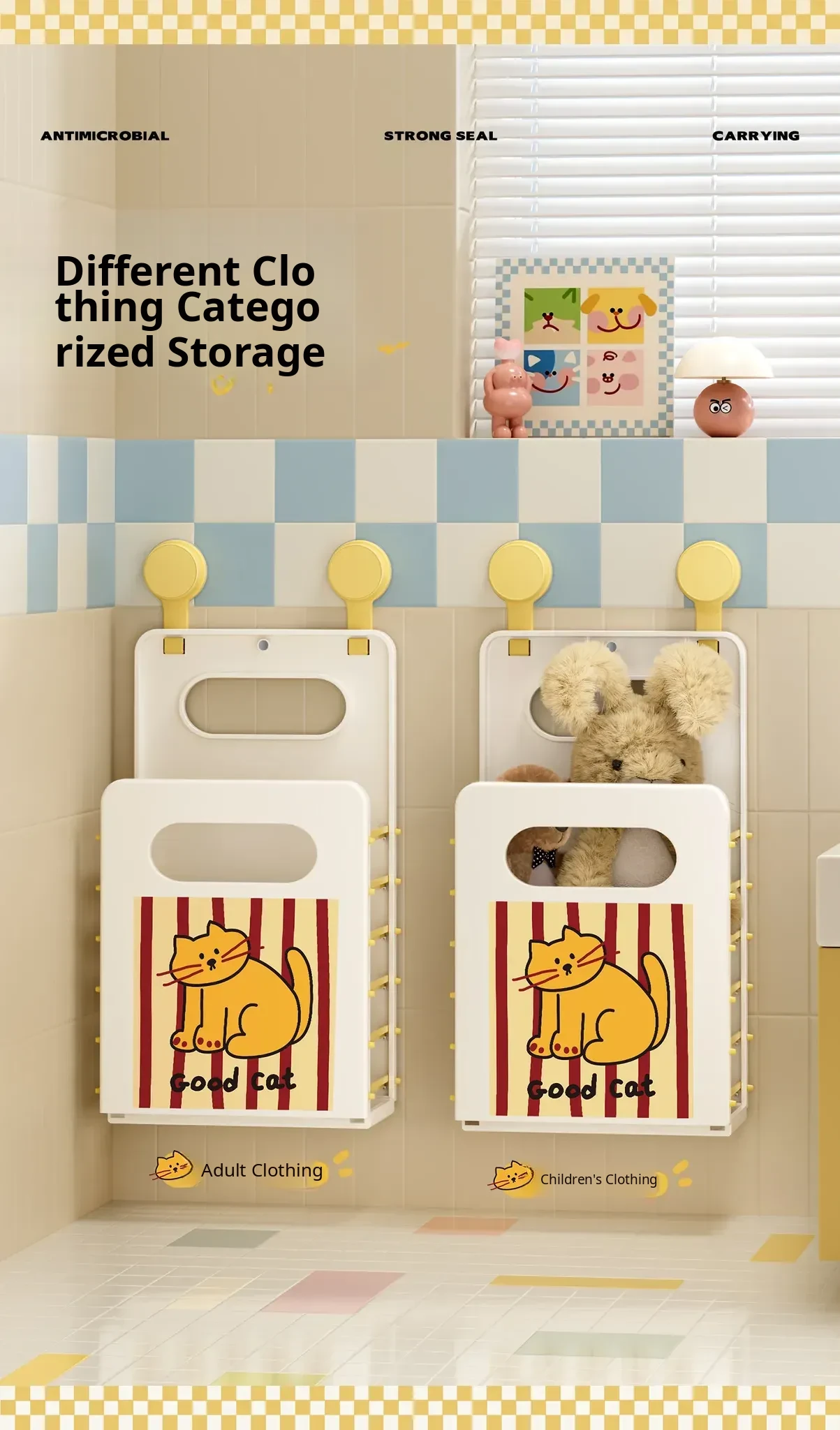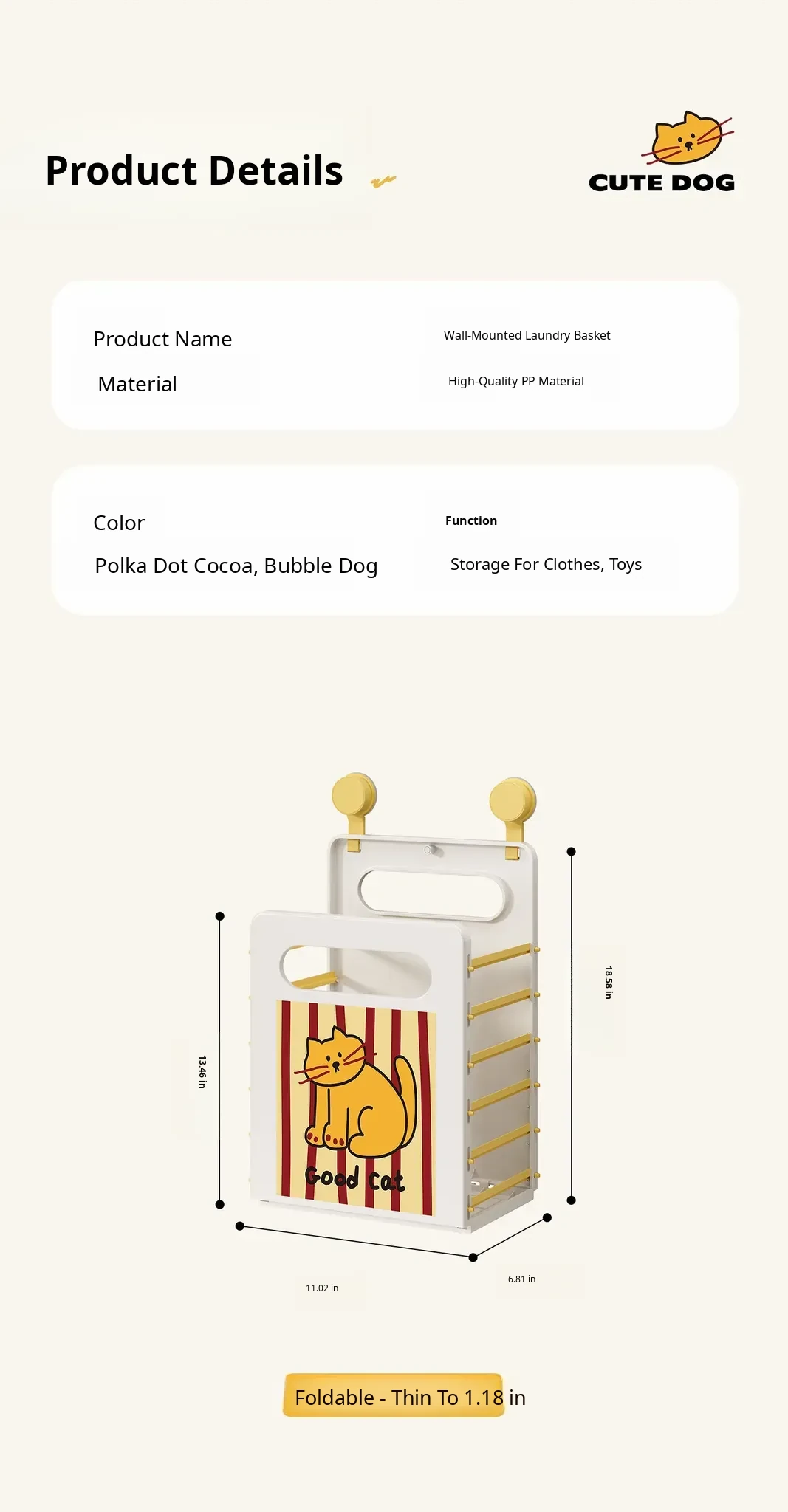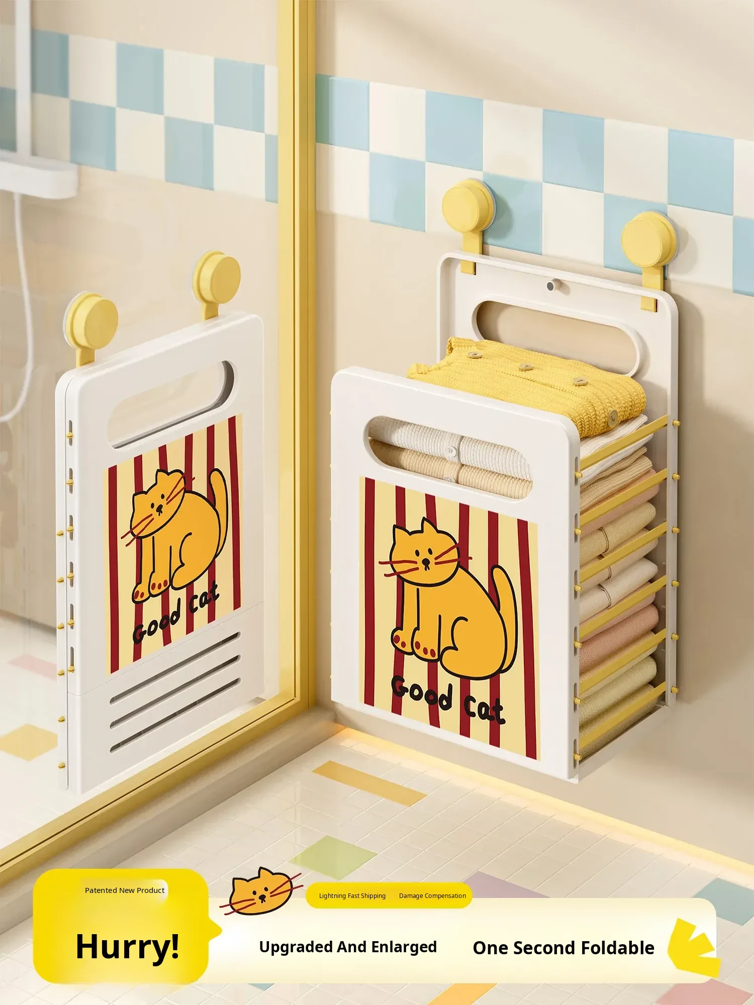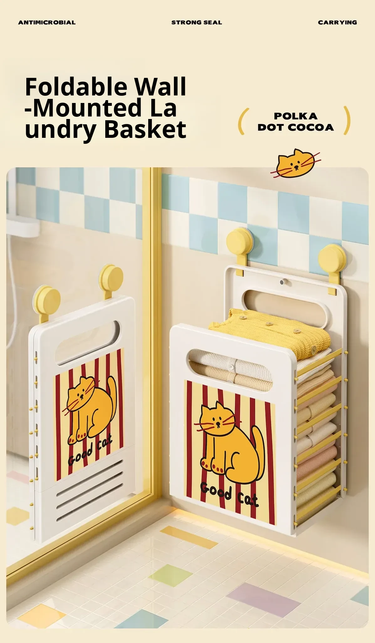 Cartoon Cat Wall-Mounted Foldable Laundry Basket - Large Capacity Storage Bin with Suction Cups, No Drilling Required for Bathroom Use