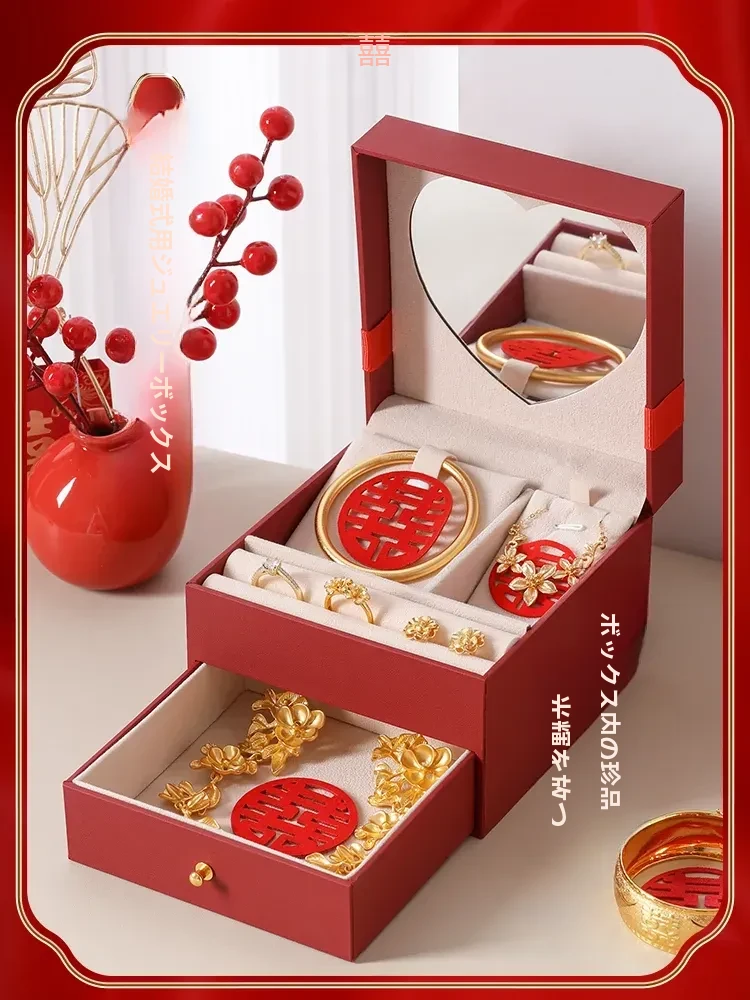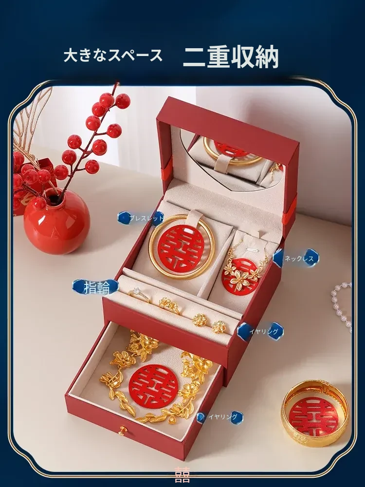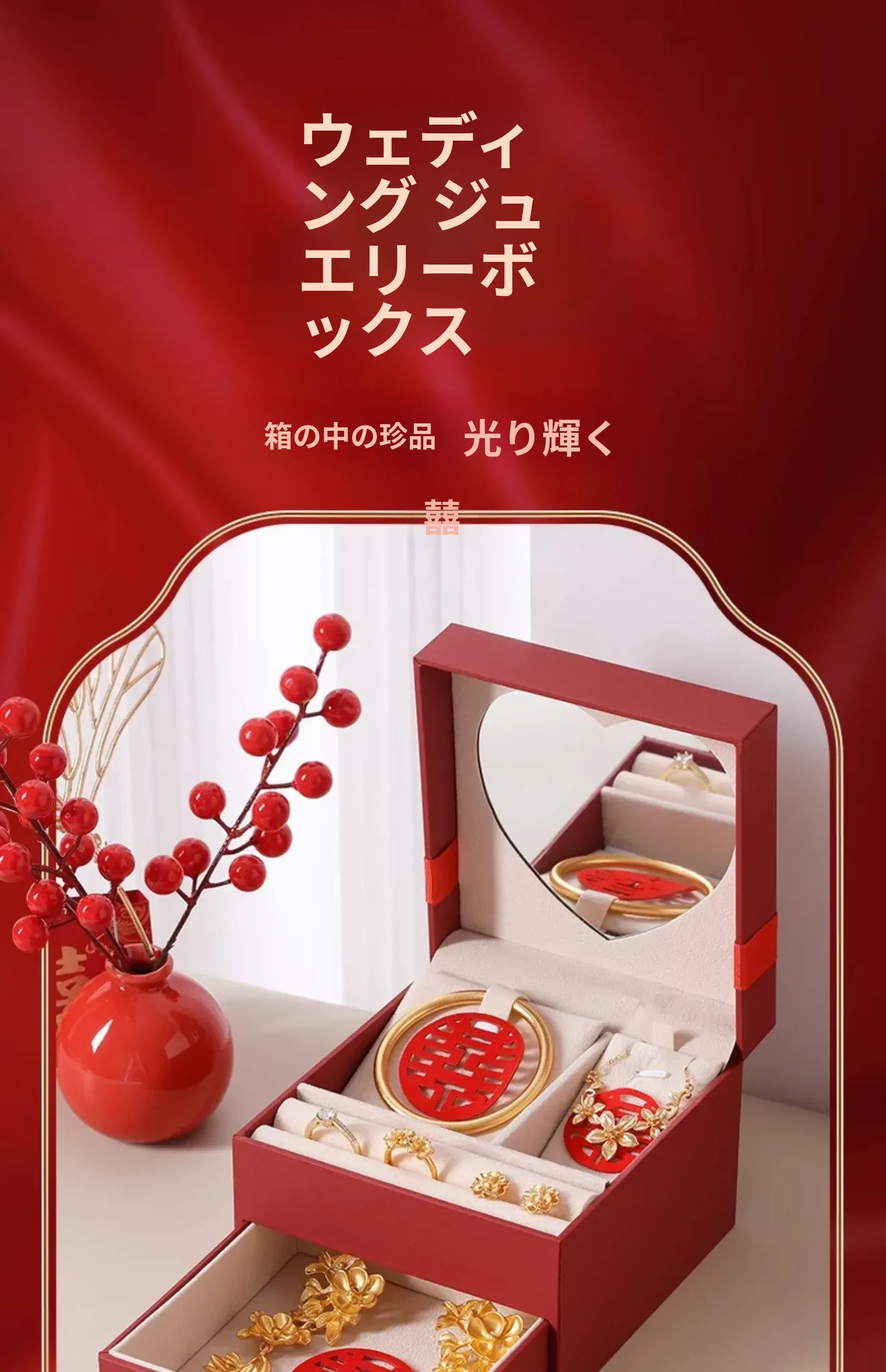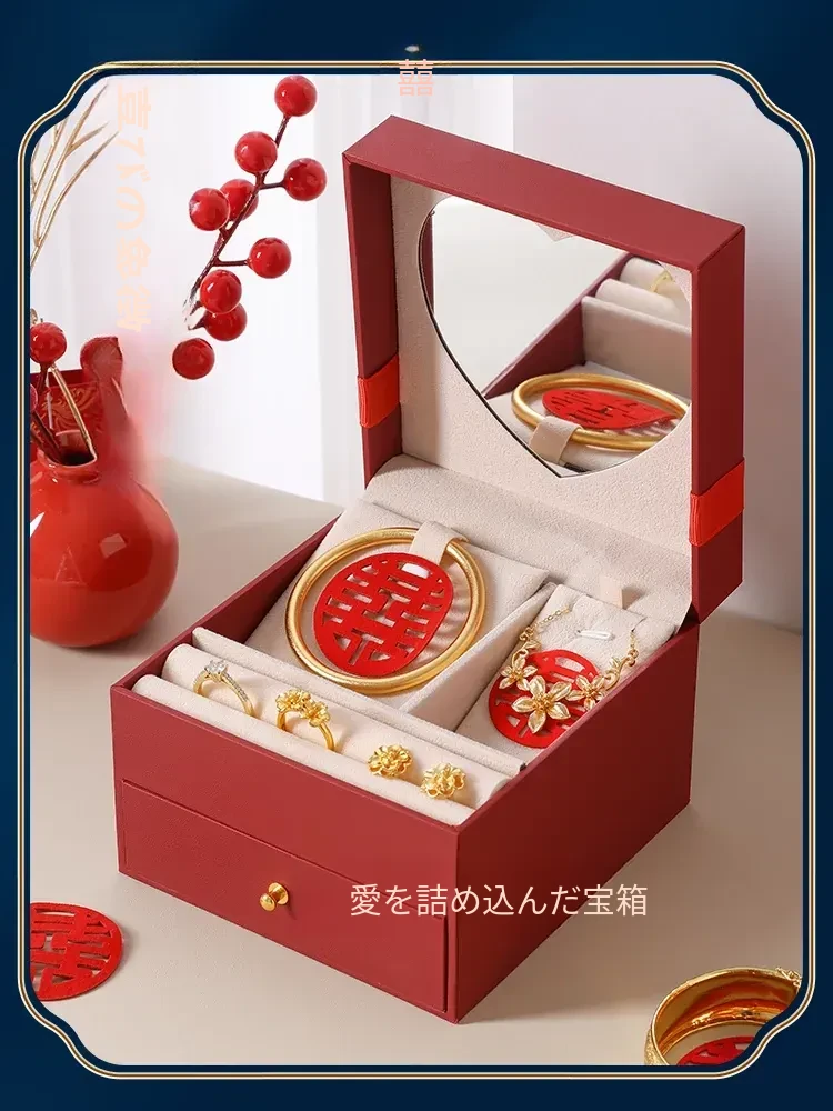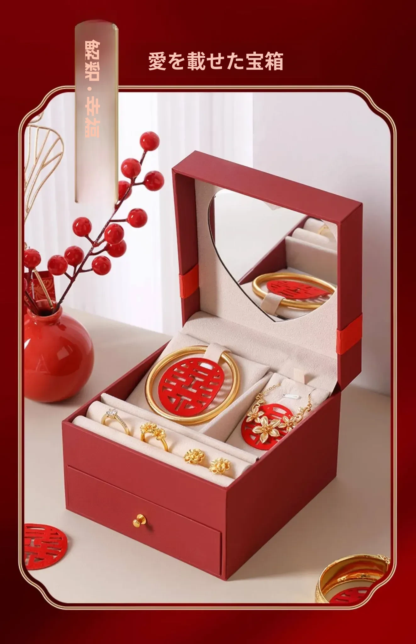 Dジュエリーボックス 高級感漂う結婚嫁入り用 赤色レザー製 ゴールド収納ボックス 鏡付き 新婚祝いギフトに最適!大切な宝物を美しく保管します。