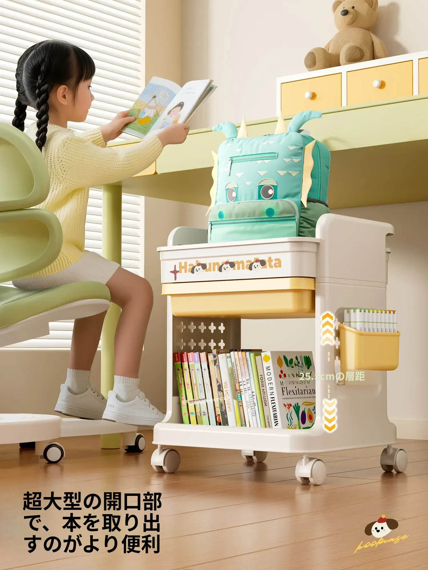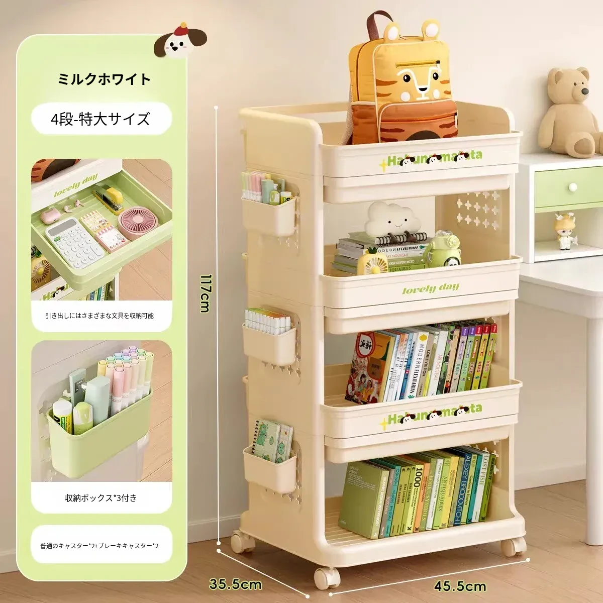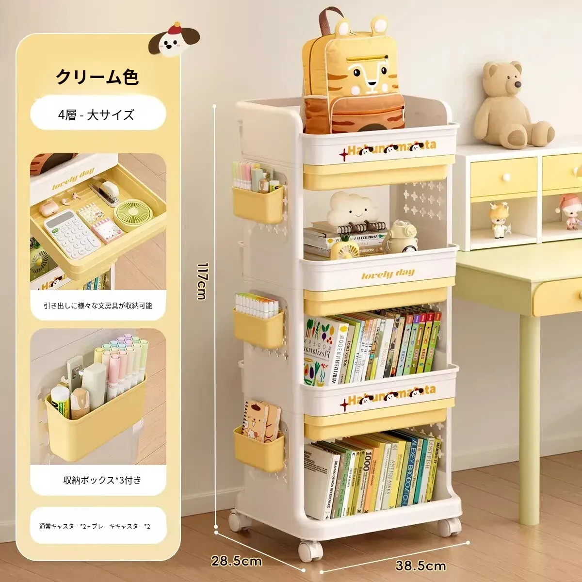 大号奶黄【4層+3引き出し】バスケット*3付き【約90冊/小中学校用】-
