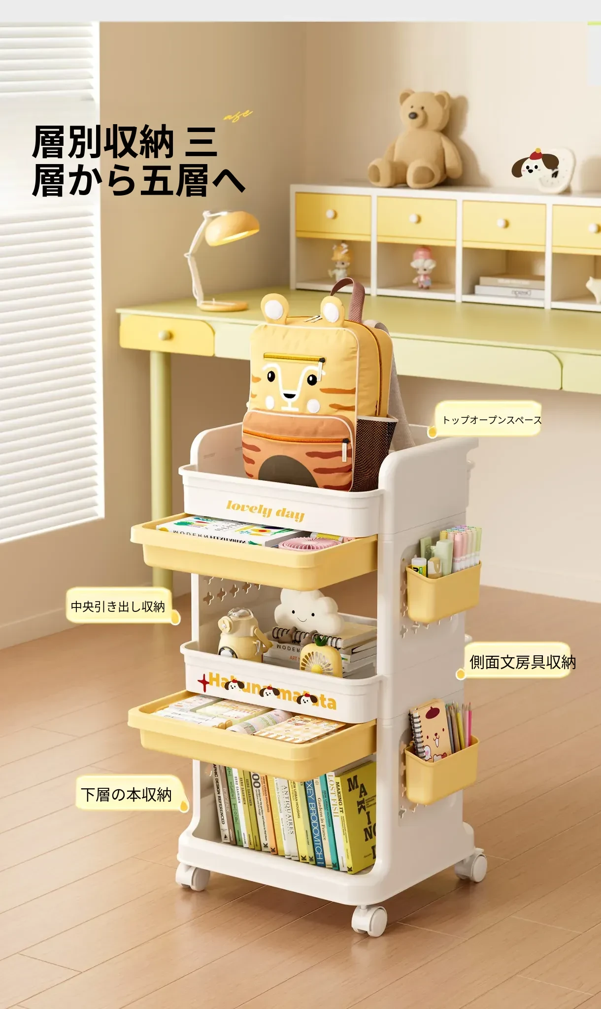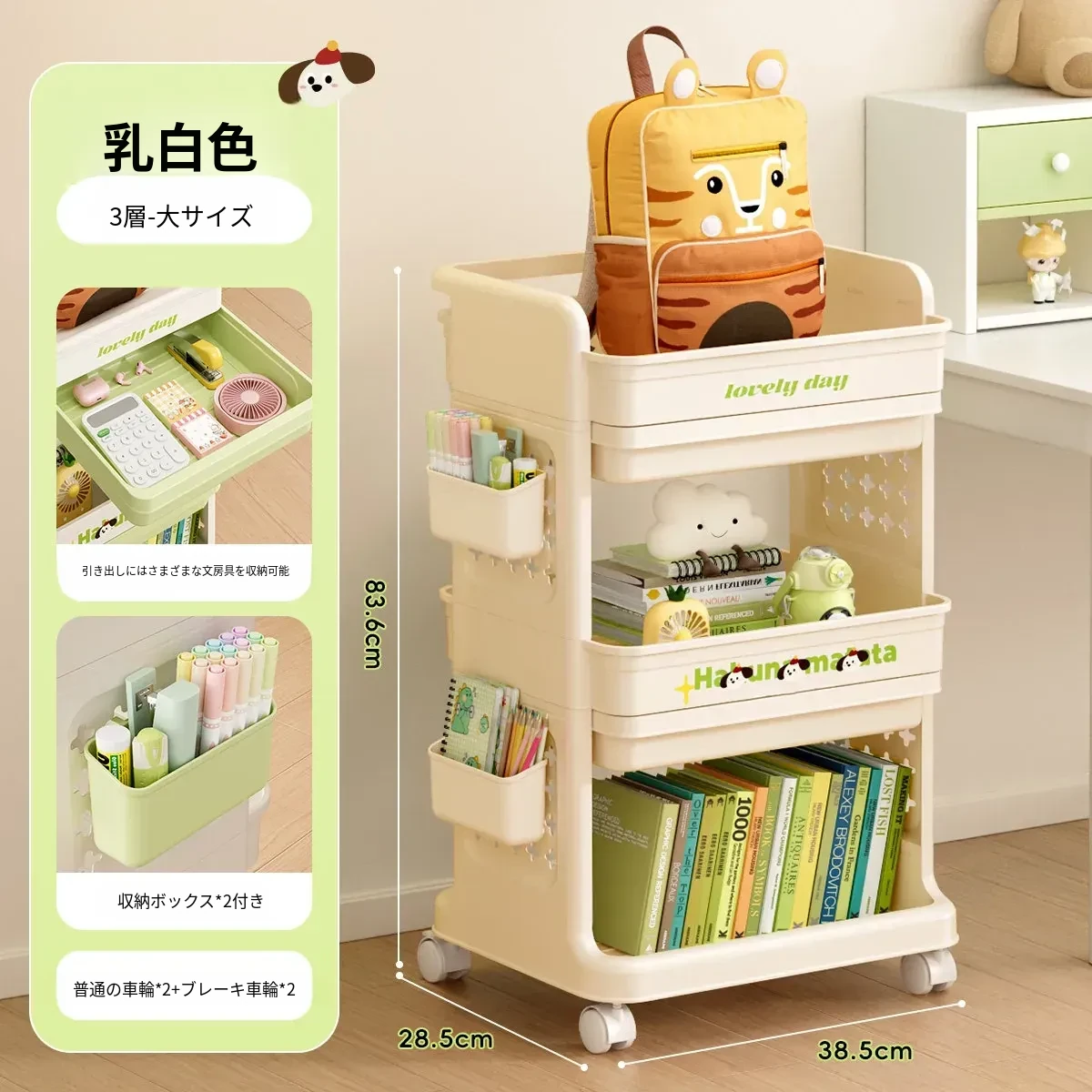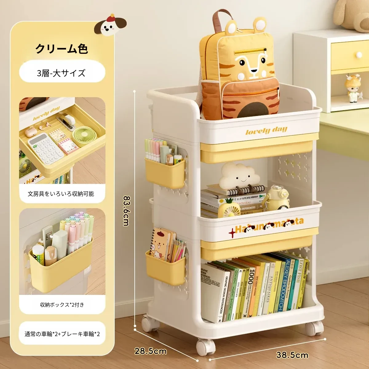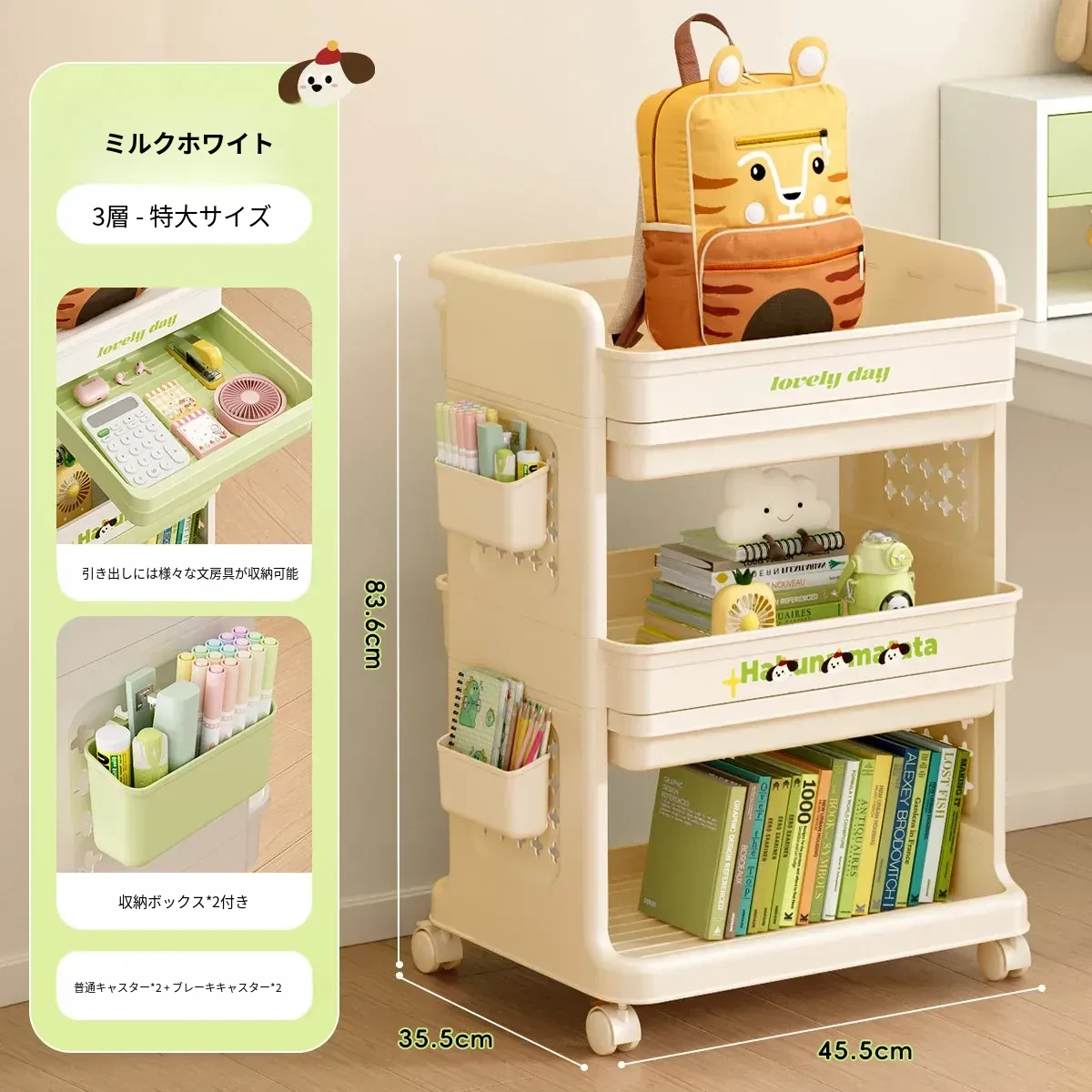 大号奶黄【3層+2引き出し】バスケット*2付き【約60冊/小中学校用】