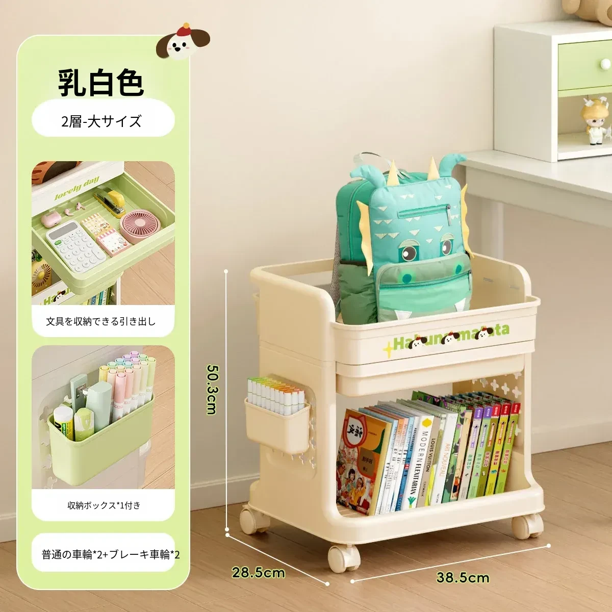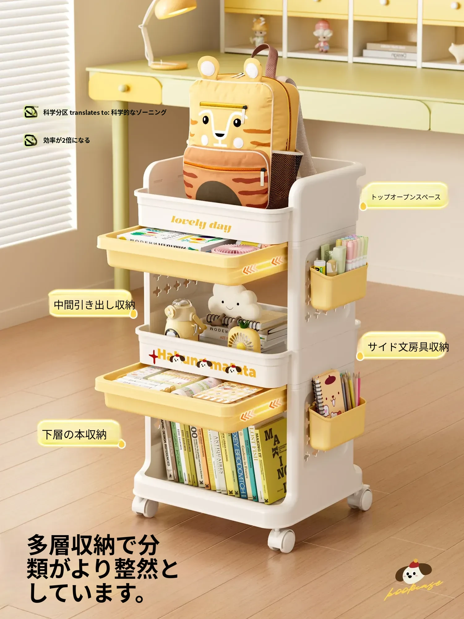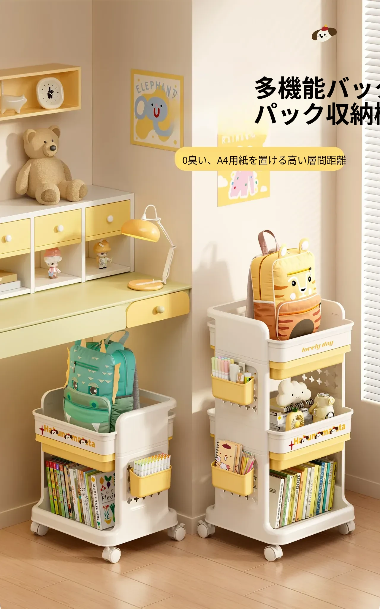 大号奶黄【3層+2引き出し】バスケット*2付き【約60冊/小中学校用】