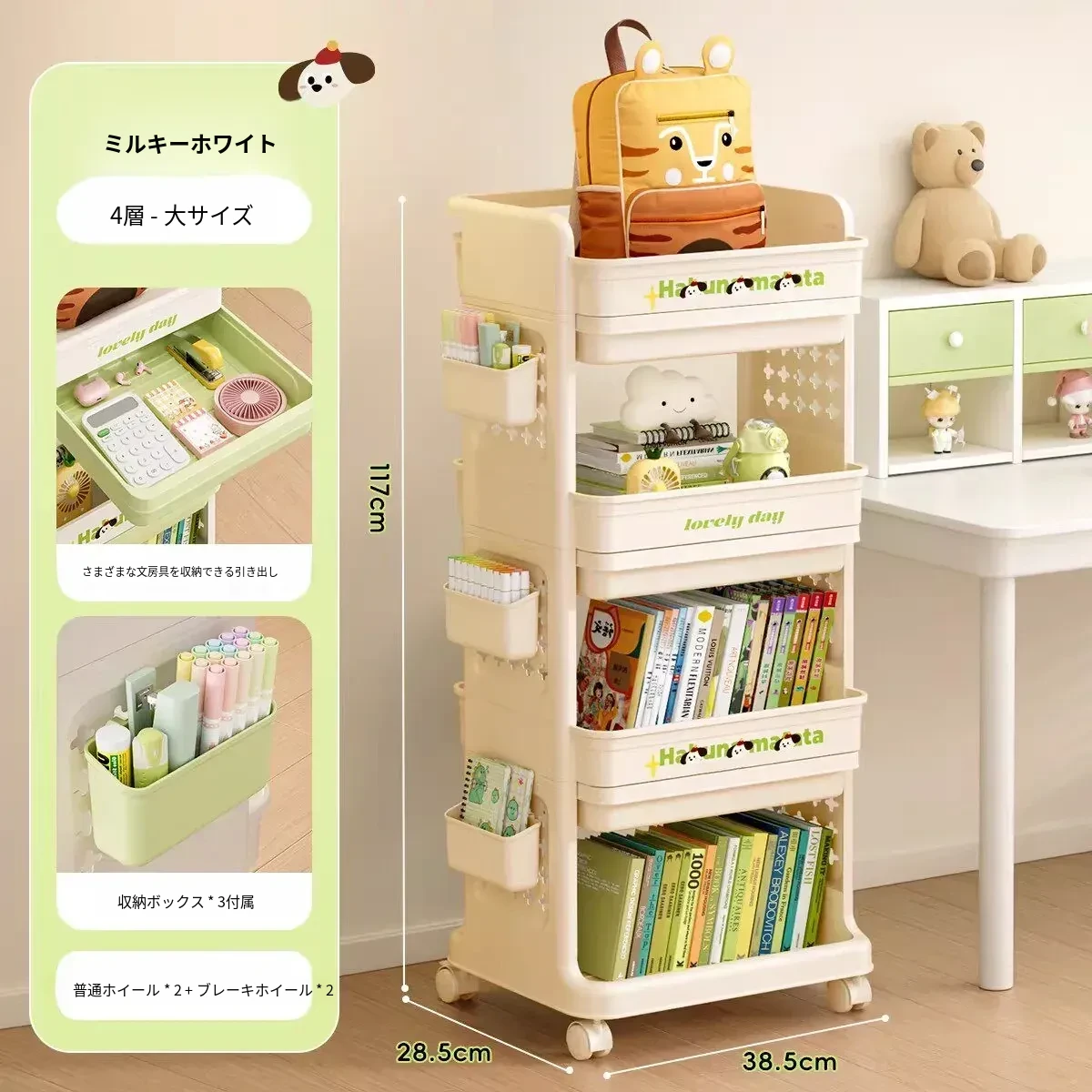 大号奶白【4層+3引き出し】バスケット*3付き【約90冊/小中学校用】-
