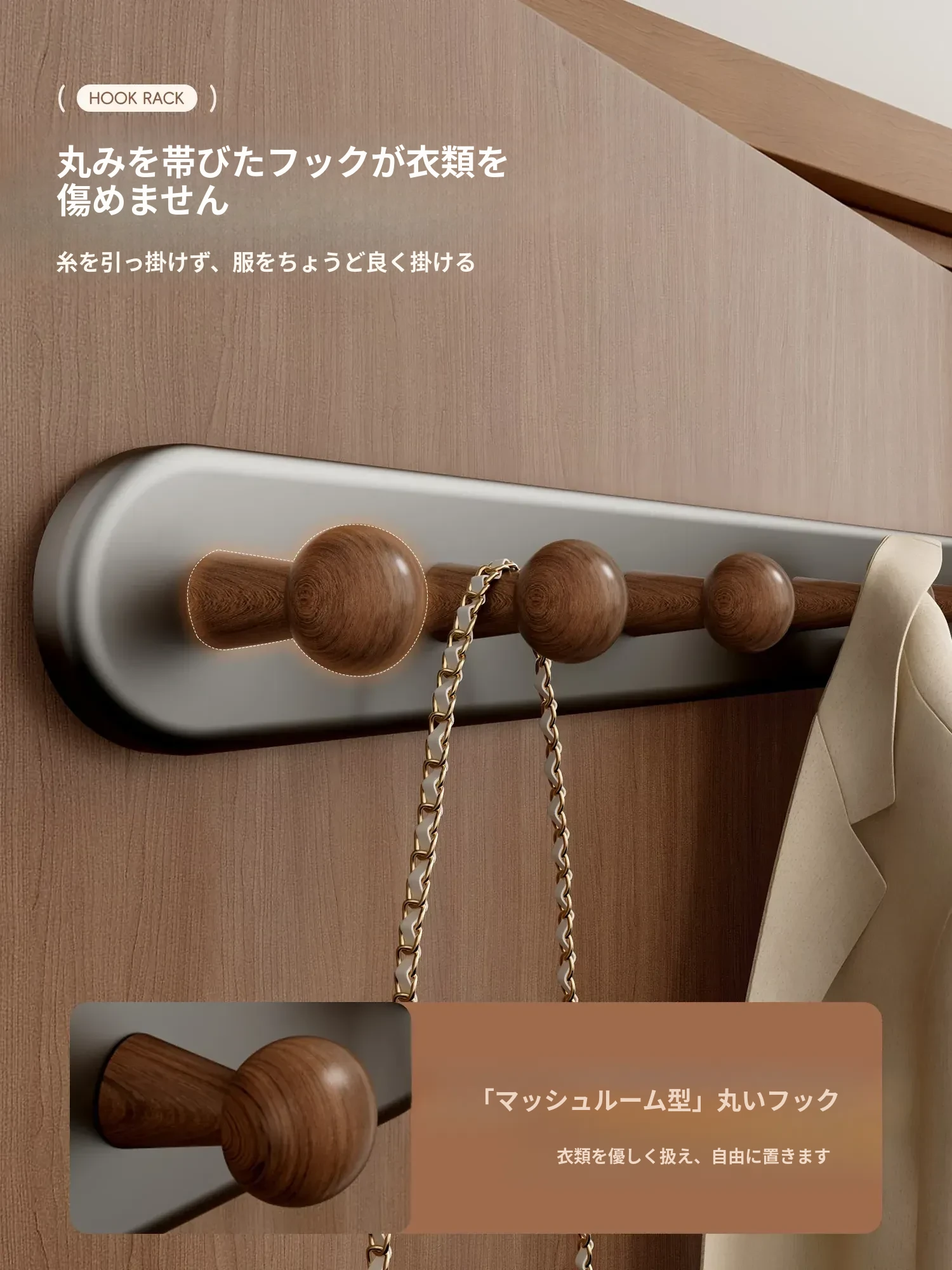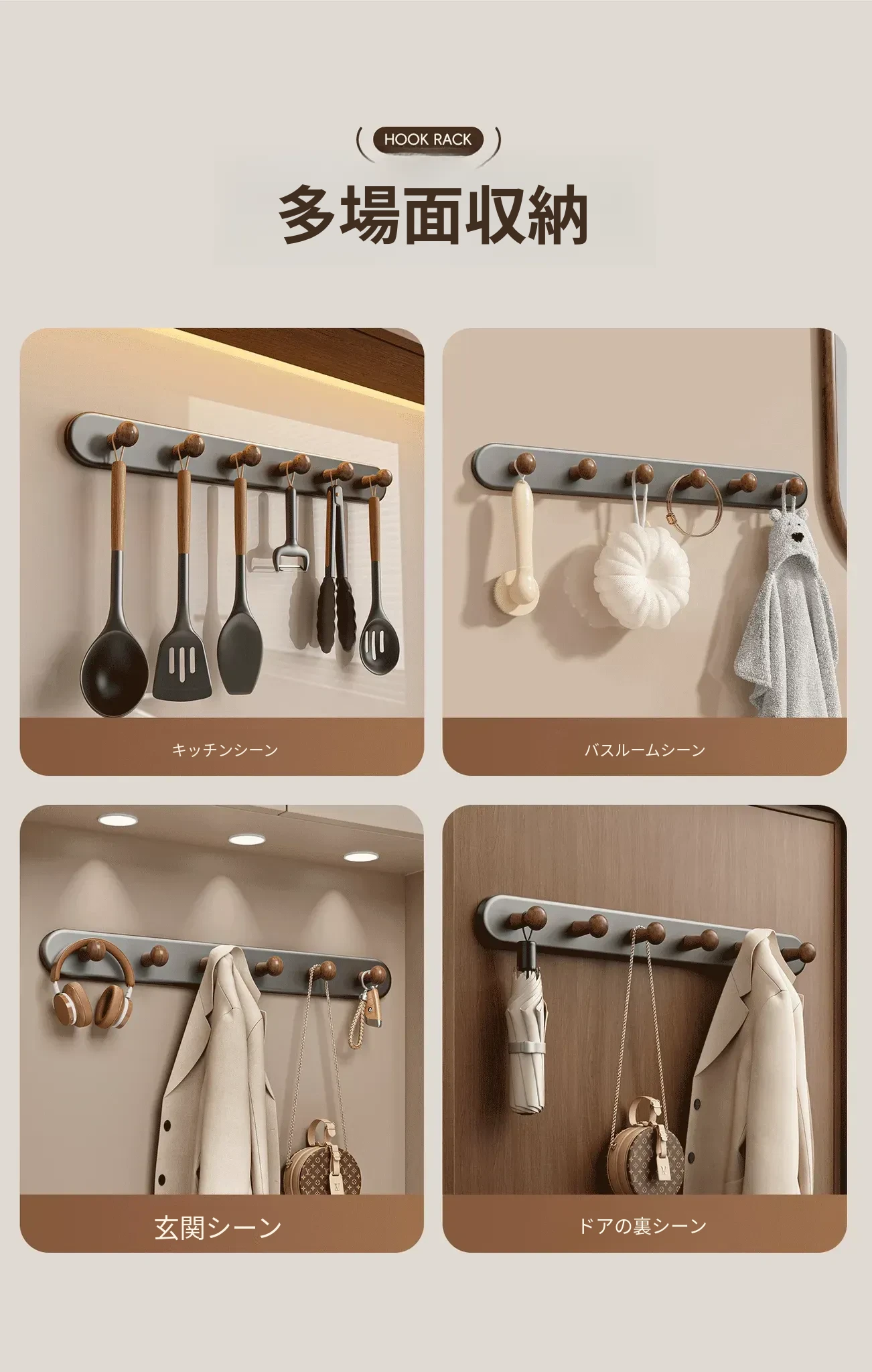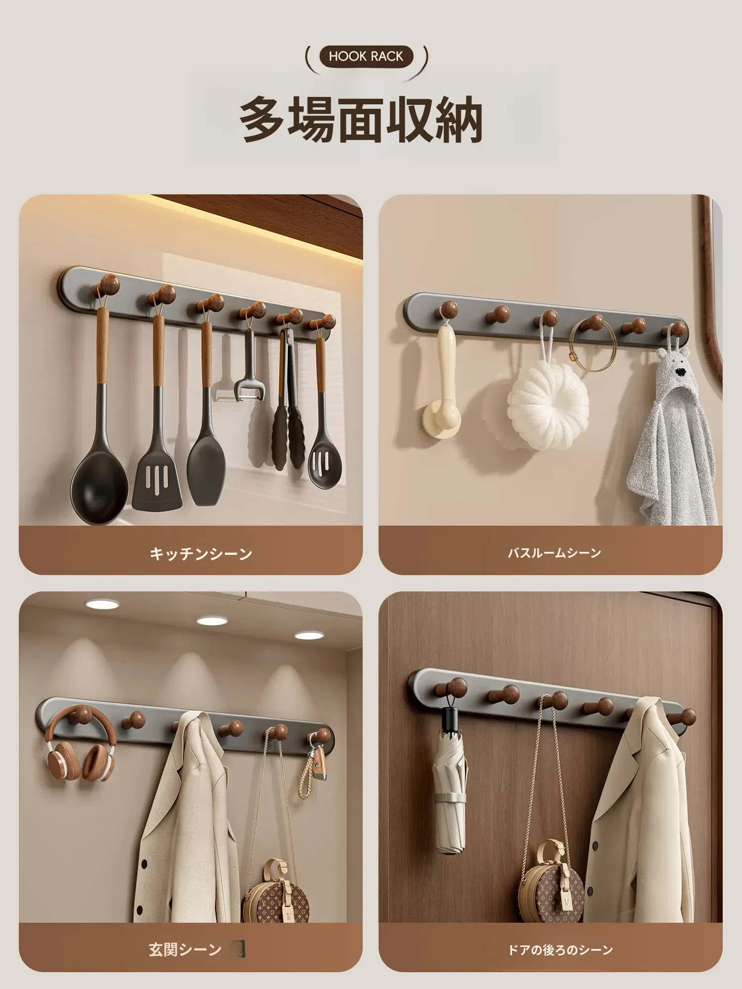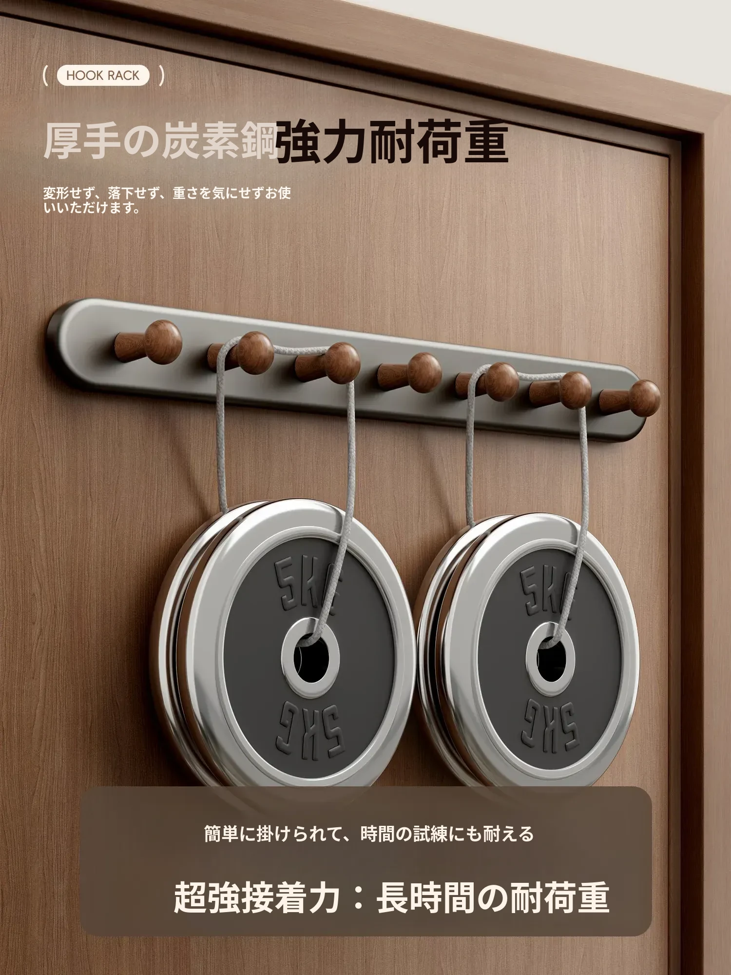 ウォールナット色5フック【強力耐荷重/長持ち】ホワイトプレゼント
