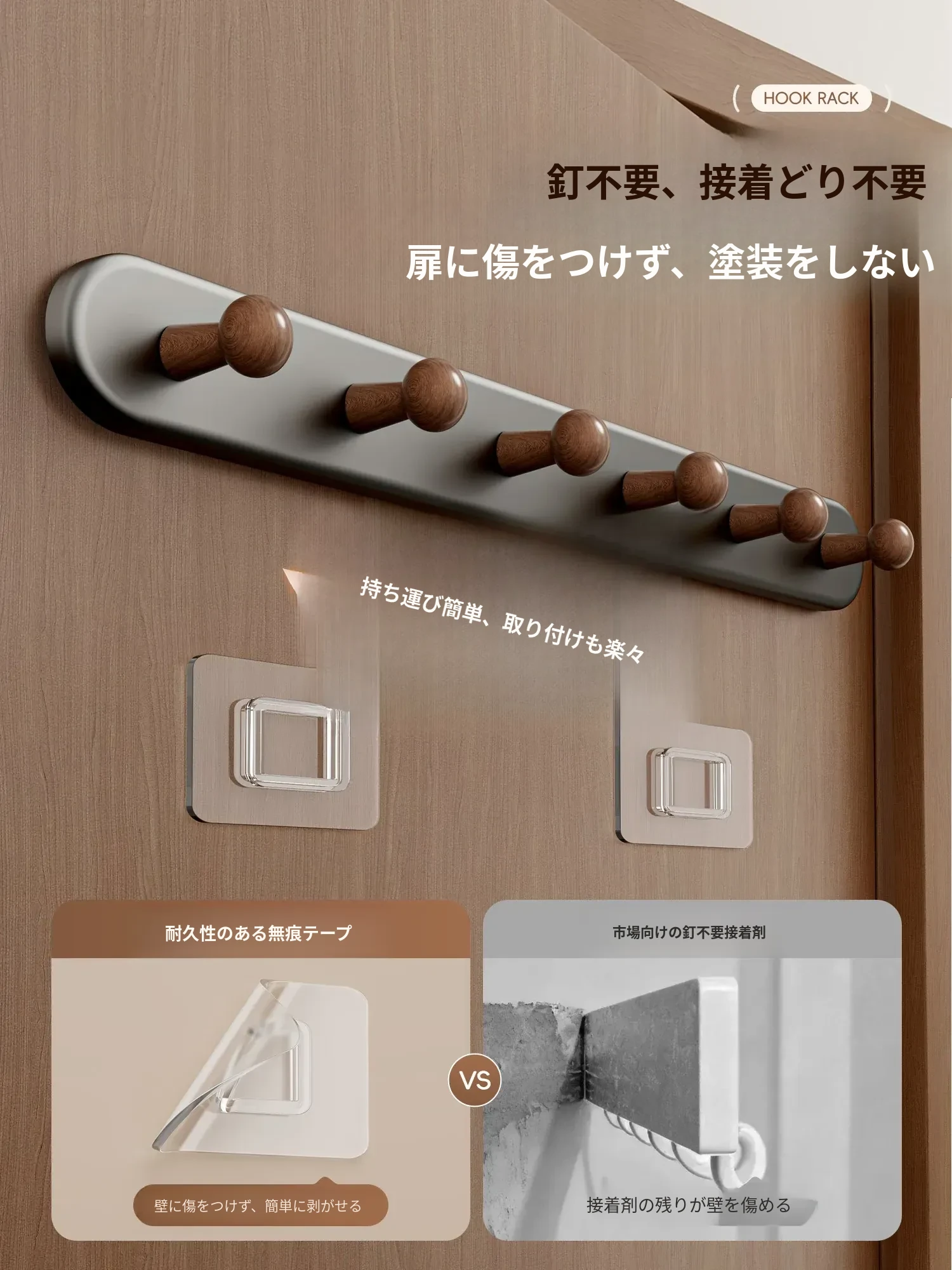 ❤️ウォールナット色7フック【穴あけ不要/ドアを傷めない】ホワイトプレゼント