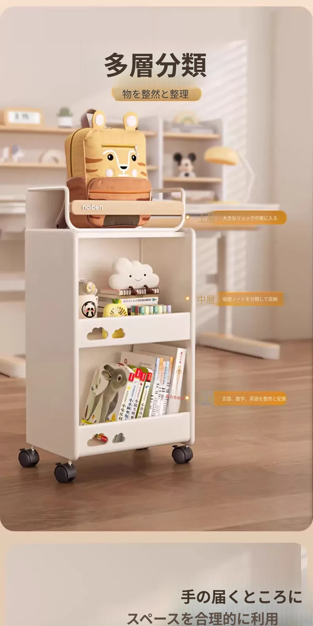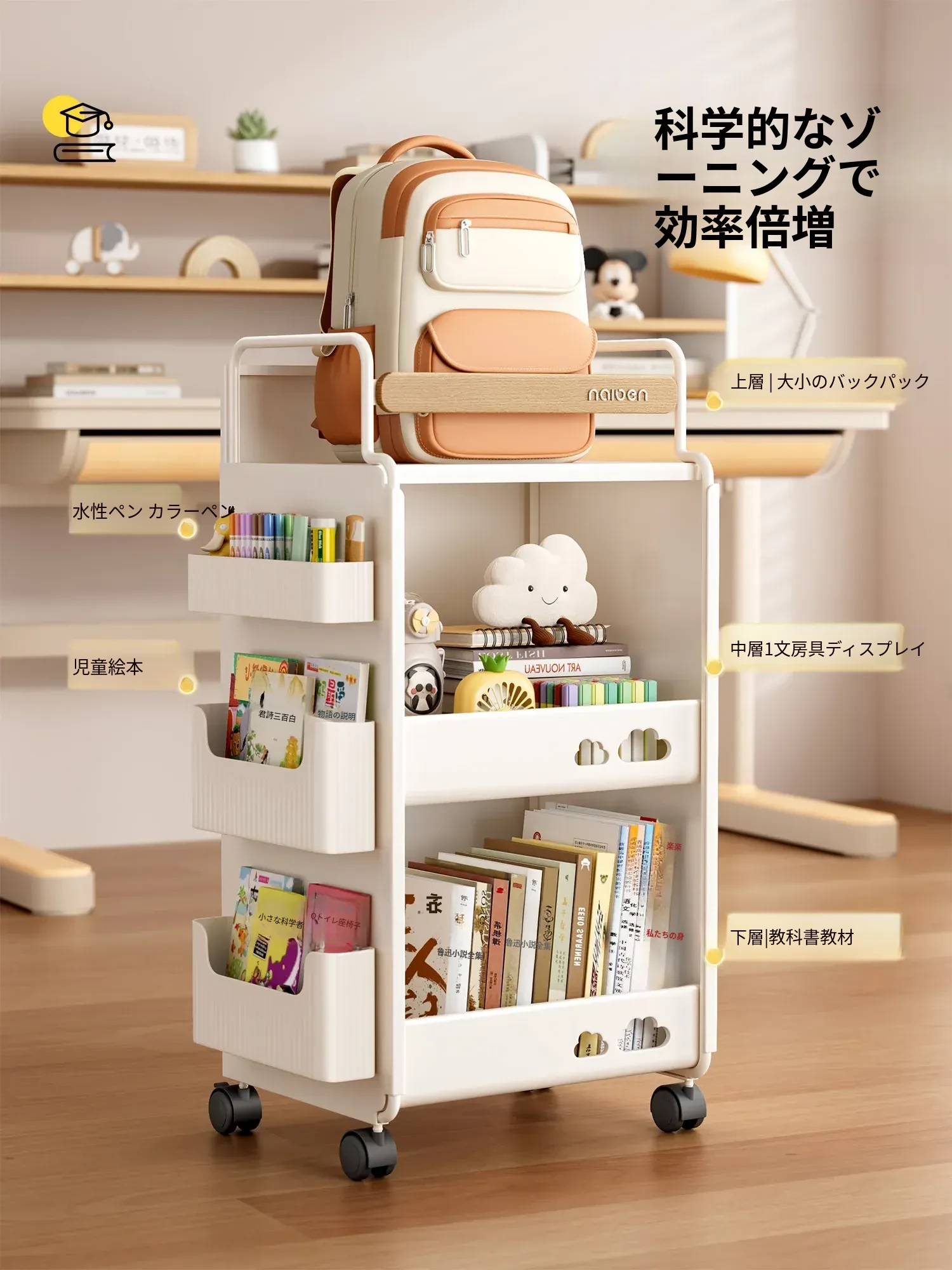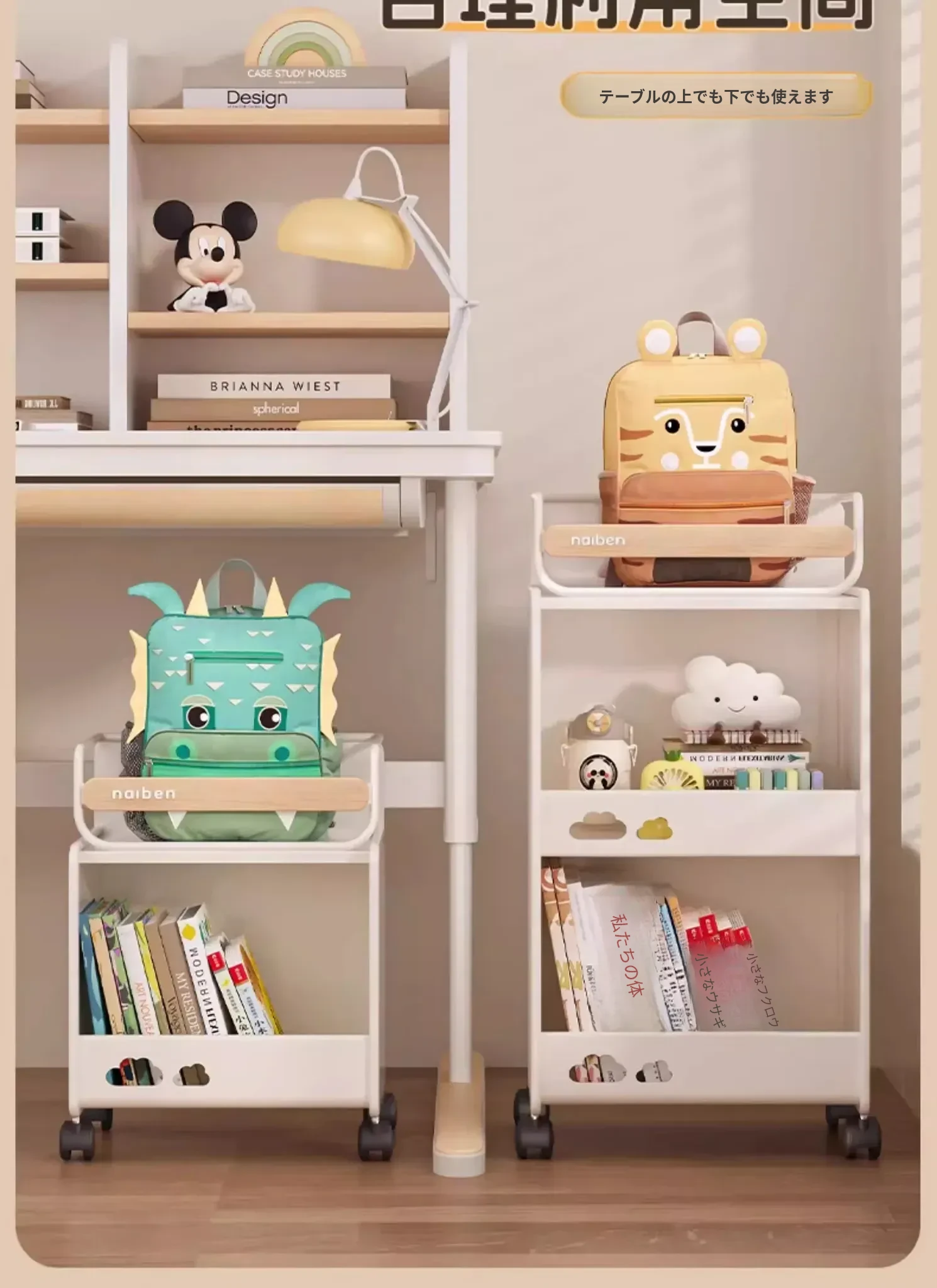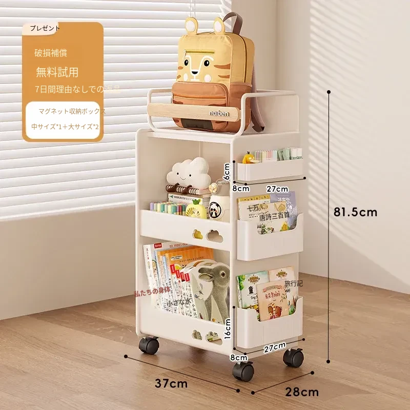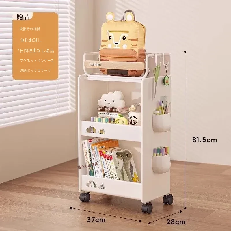 おしゃれな移動式収納カート!キッチンや学習スペースにぴったりな本やおやつを整理できる棚。子供部屋にも最適なコンパクトデザインで、家の中をスッキリ整頓!