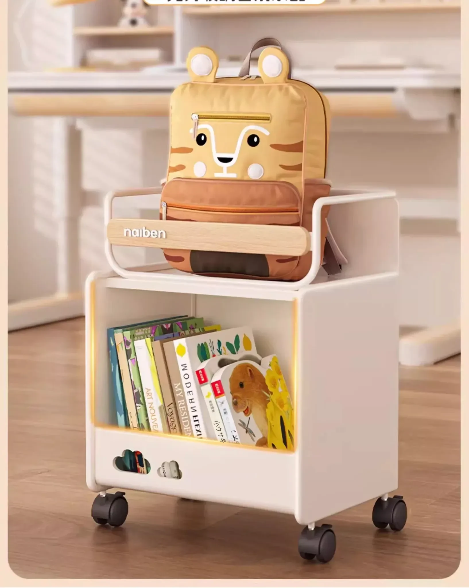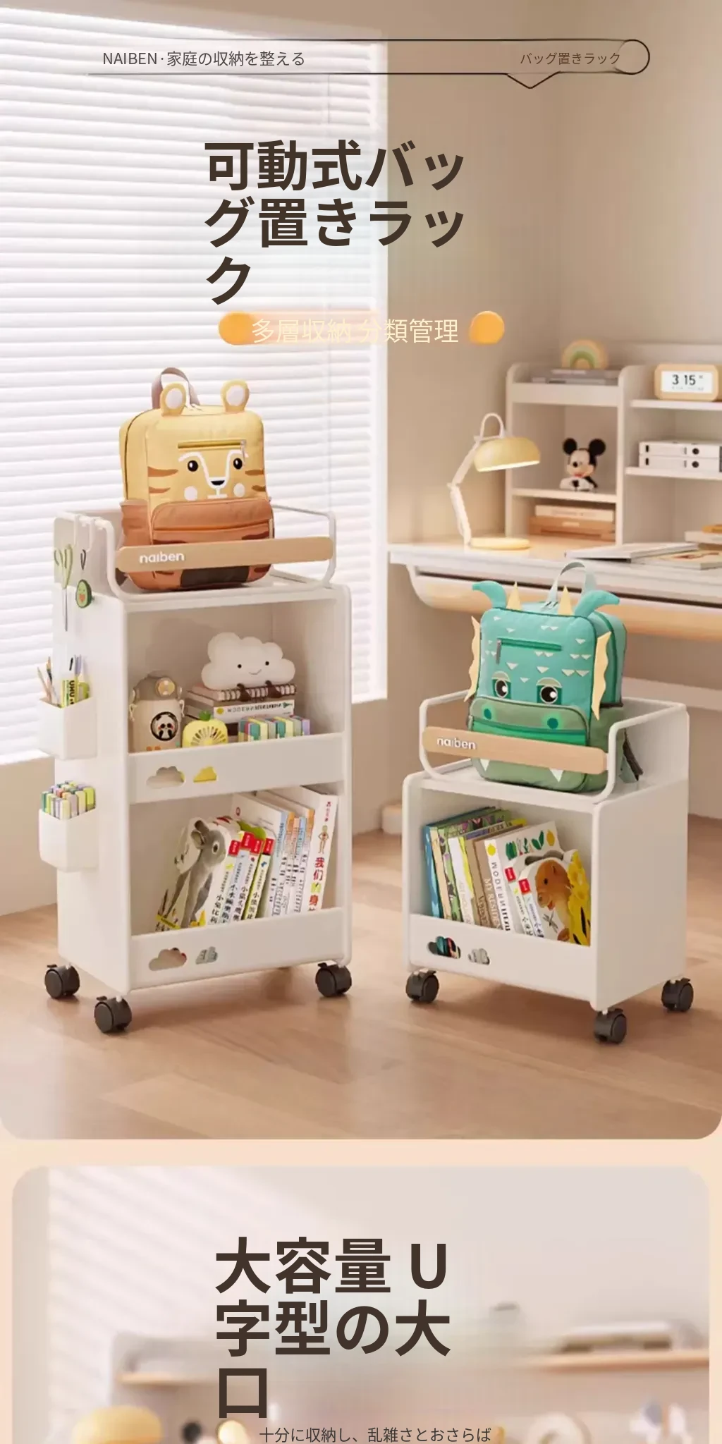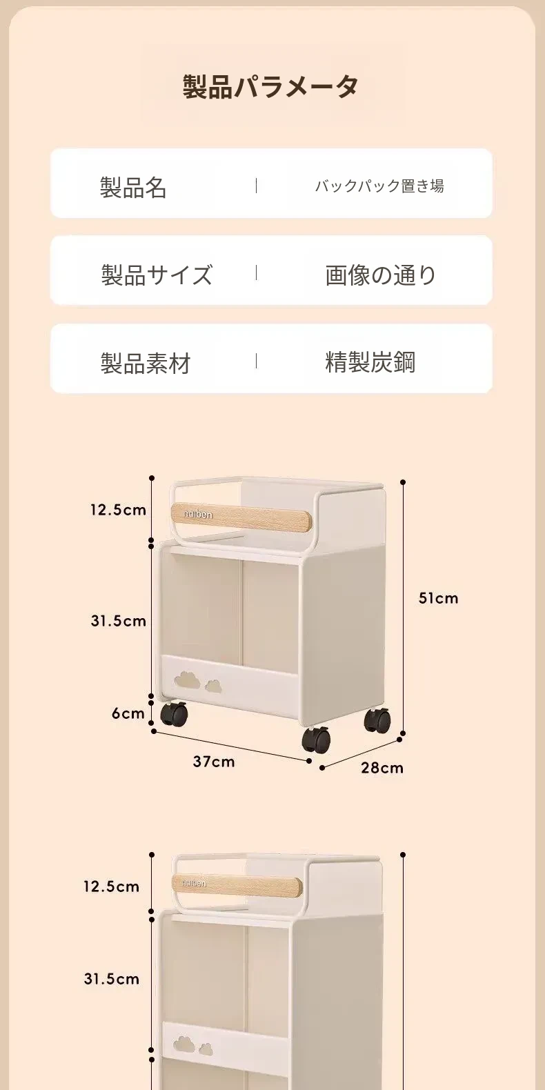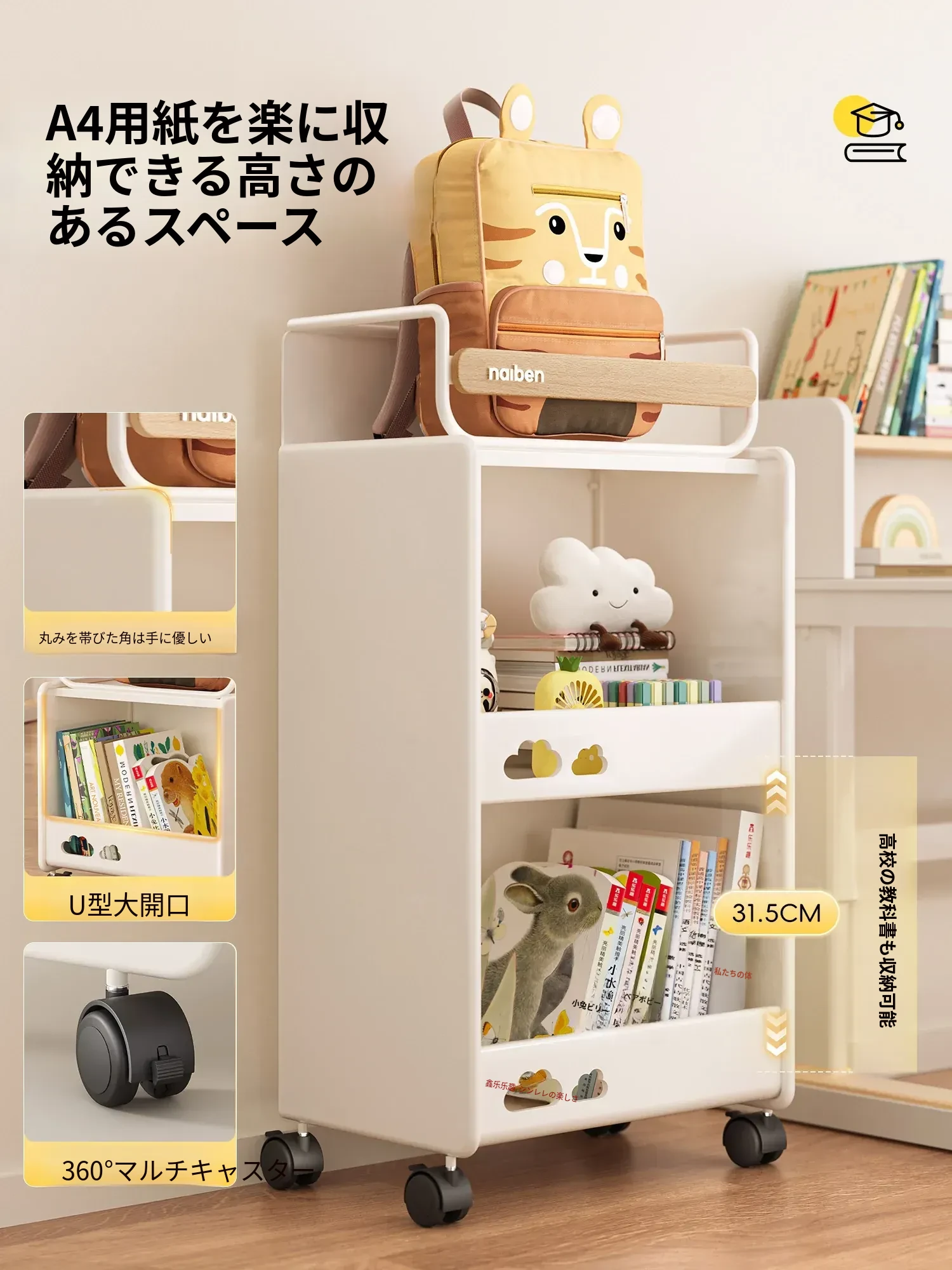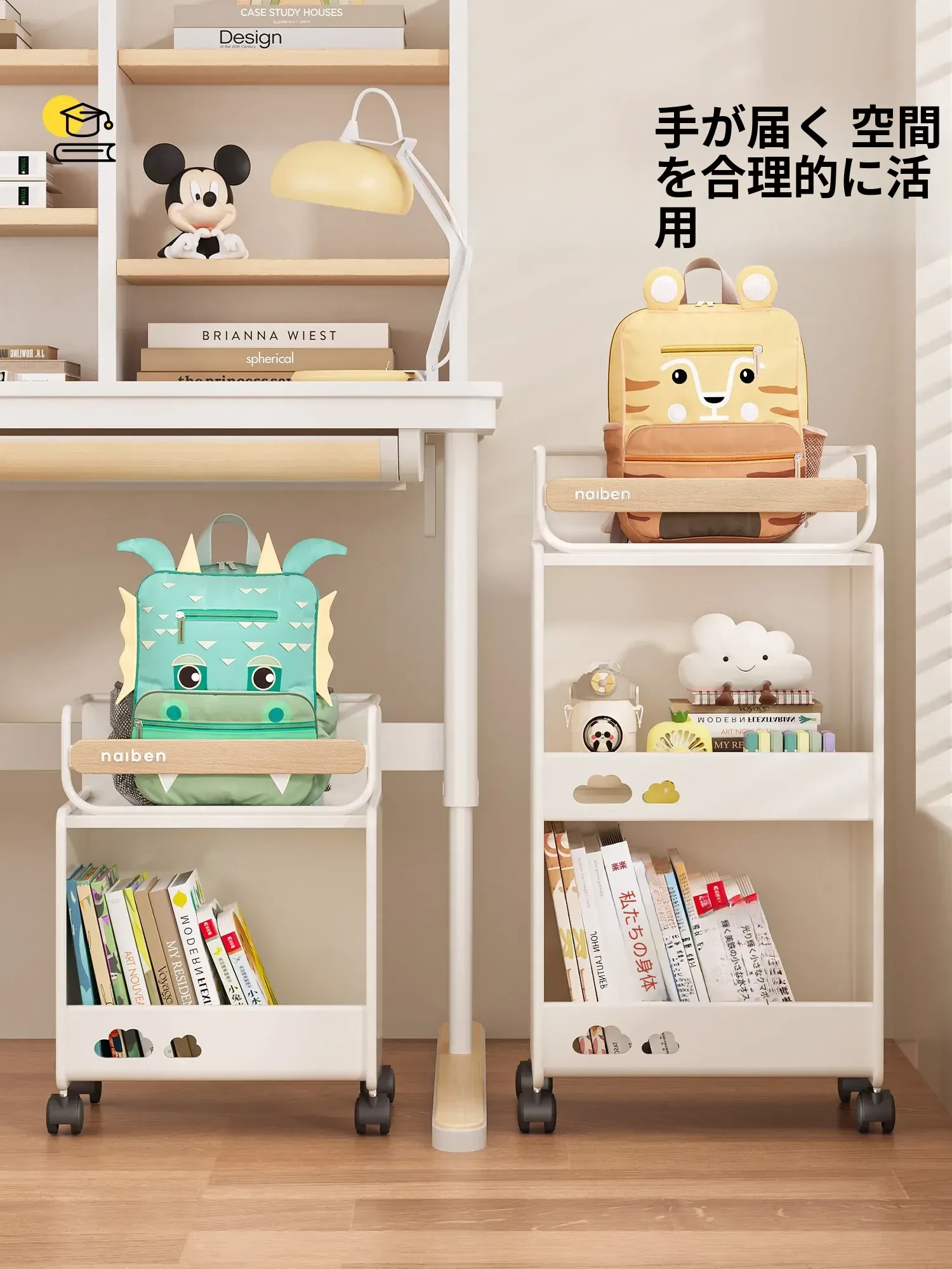 おしゃれな移動式収納カート!キッチンや学習スペースにぴったりな本やおやつを整理できる棚。子供部屋にも最適なコンパクトデザインで、家の中をスッキリ整頓!