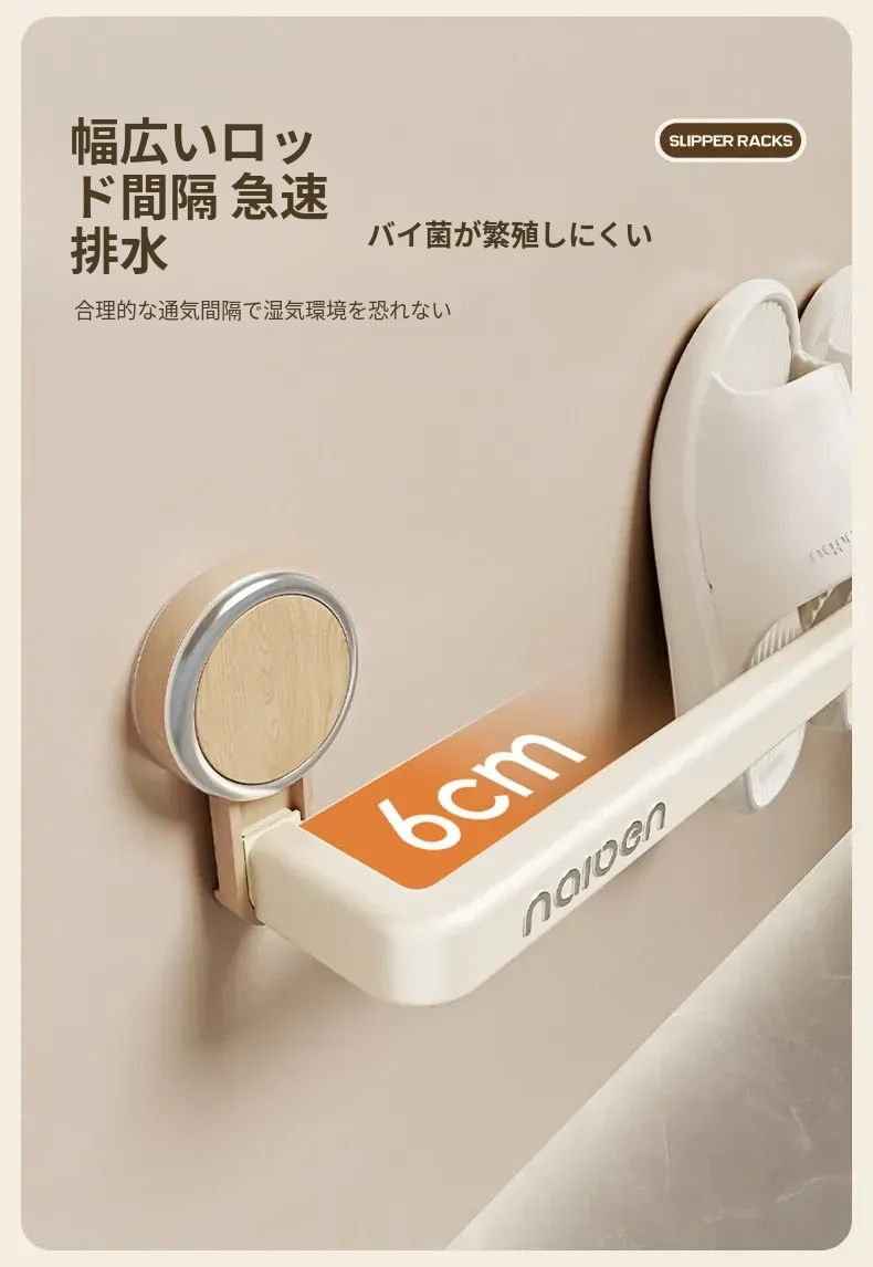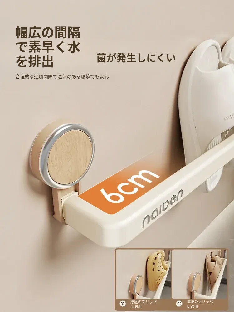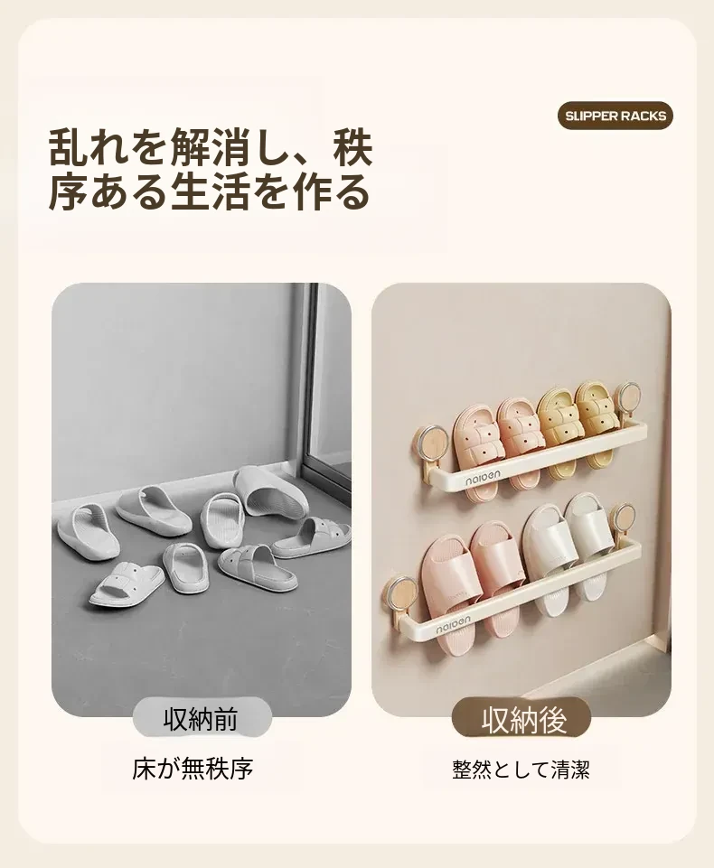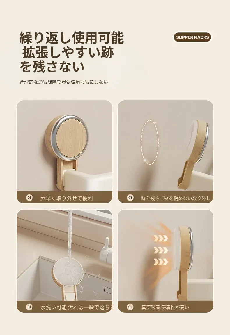 吸盤式スリッパラック - バスルームに最適!穴あけ不要で取り付け簡単、湿気を逃がすデザインで清潔をキープ。玄関やトイレにぴったりな収納アイテムで、スリッパや小物をスマートに整理!
