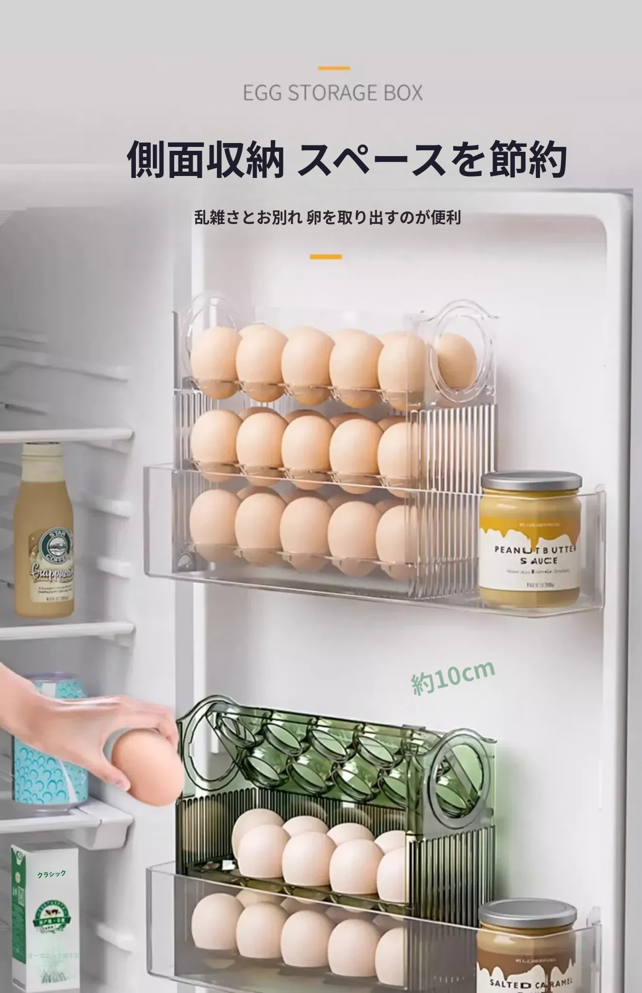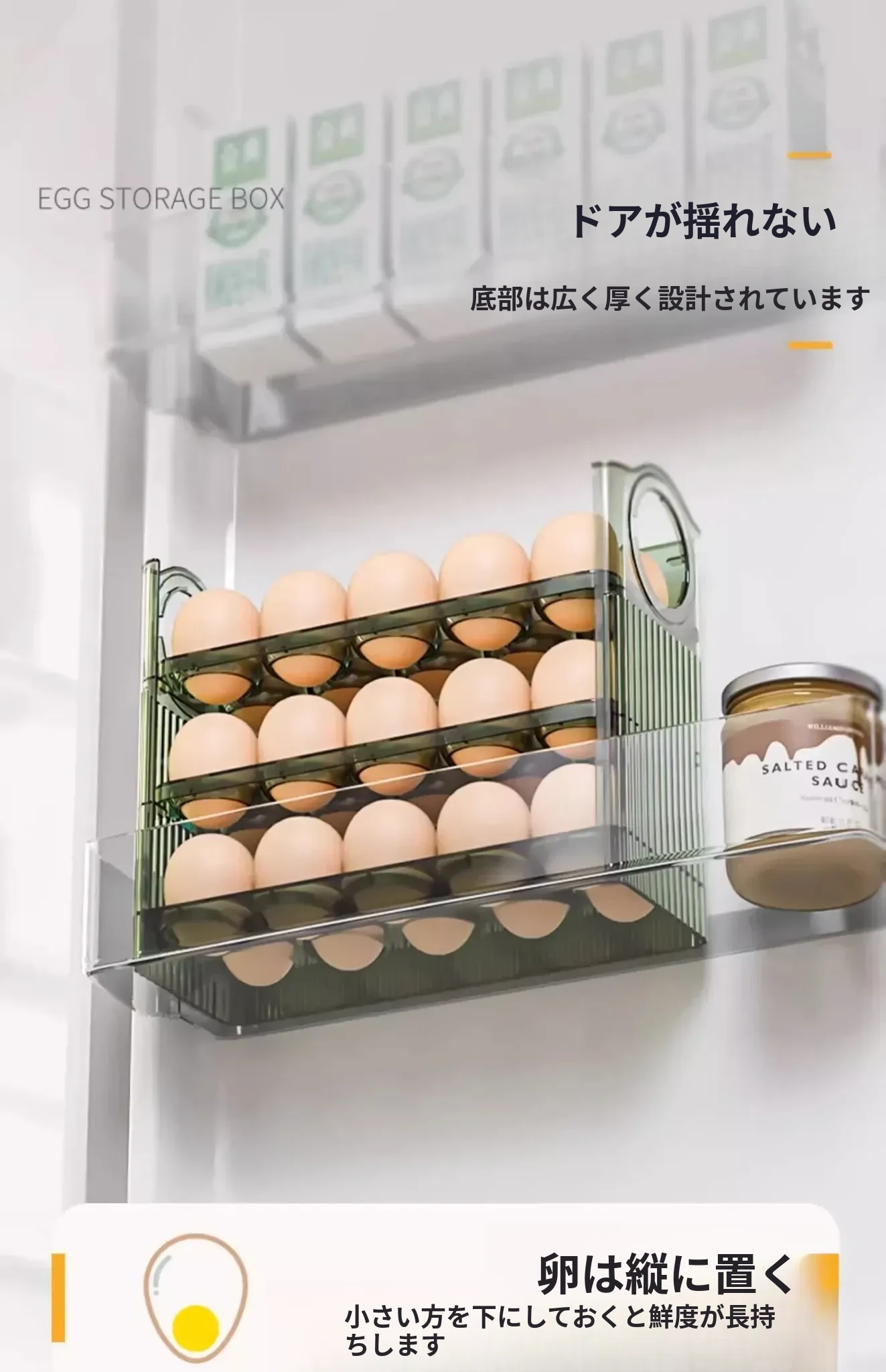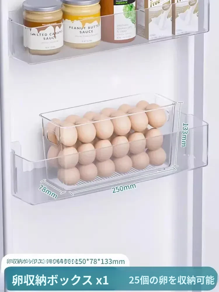 食品グレードの透明卵収納ボックス - 冷蔵庫のサイドドアにぴったり!卵を鮮度を保ちながら美しく整理できる便利なトレイ。おしゃれで機能的なキッチンアイテムです。