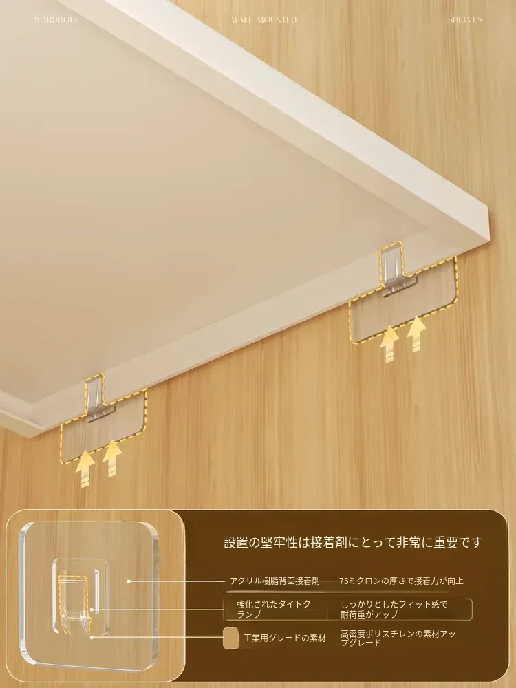 強力透明無痕で取り付け簡単!衣類収納に最適な分層棚板用パーツ、穴あけ不要の粘着フック付き壁掛け収納ラック