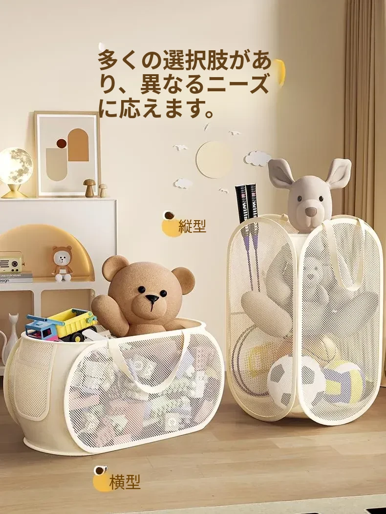 子供のための大容量おもちゃ収納バスケット!リビングにぴったりのふわふわぬいぐるみやブロックもすっきり整理。持ち運び便利なハンドル付きで、家の中がいつでもきれいに!