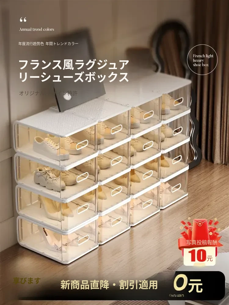 話題のシューズ収納ボックス!透明プラスチック製の引き出し式シューズケース。家で使える厚手の防塵設計で、靴をスタイリッシュに整理!完璧なシューズラックで、あなたの靴を守ります。