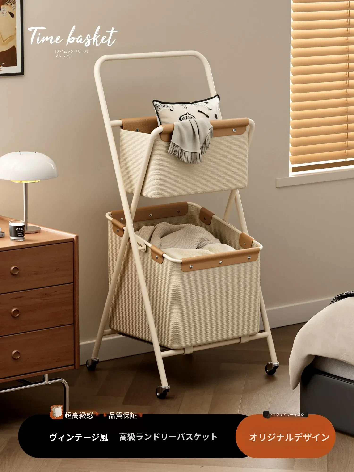 スタイリッシュな二層式ランドリーバスケット - 折りたたみ可能で、衣類を分けて収納できる便利な収納ラック!おしゃれで機能的なデザインで、洗濯物もスッキリ整理。